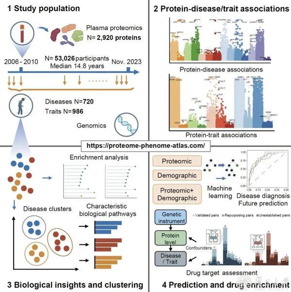 该研究通过深入分析53,026名个体的血浆蛋白质组数据,跨越了14.8年的中位随访期,建立了全面的蛋白质组图谱。该图谱涵盖了2,920种血浆蛋白质与406种既往患病、660种随访新发疾病以及986种健康相关表型,揭示了168,100个蛋白质-疾病关联和554,488个蛋白质-表型关联。研究中发现超过650种蛋白质与至少50种疾病存在联系,而超过1000种蛋白质表现出性别和年龄的异质性,这些发现加深了我们对疾病间共享和特异分子机制的理解,揭示了不同人群在疾病易感性上的差异,为精准诊疗提供了科学依据。