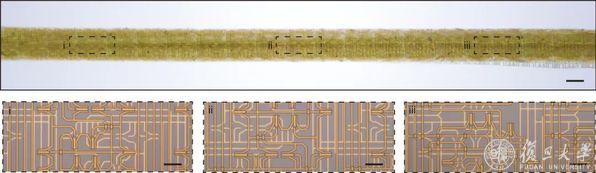 “纤维芯片”及其内部局部电路光学照片