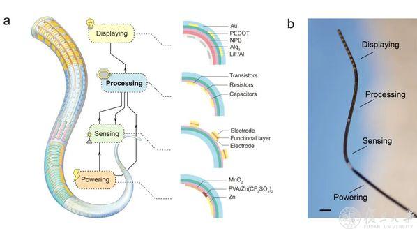 随着研究深入,一个关键问题浮现出来:就像手机、电脑离不开芯片,将不同功能纤维器件形成完整的系统,具备信息交互功能,也必须有自己的“大脑”——一个能够处理信息的核心芯片。然而长期以来,纤维系统的集成普遍依赖连接硬质芯片电路板,这与纤维本身柔软、透气、可编织的特点格格不入。