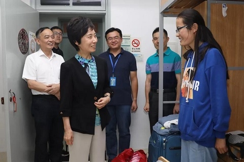 当天,复旦大学领导及相关部门负责人来到报到现场和新生宿舍看望新生和家长,并亲切慰问了服务在迎新一线的工作人员。