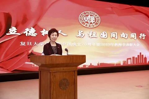 “正是因为有一批又一批教师始终默默耕耘、无私奉献、奋力拼搏,复旦才成为今日之复旦、中国之复旦,也正是因为有更多的一批又一批教师不忘初心、牢记使命、永远奋斗,复旦才有底气和自信成为未来之复旦、世界之复旦!”焦扬在讲话中深情回顾了新中国成立70年以来,在中国共产党的领导下,复旦大学经历的翻天覆地的变化,以及复旦教师为国贡献的成就。她说,一代又一代复旦教师立志为党育人、为国育才,矢志创新创造、追求卓越,笃志担当奉献、知识报国,励志以德立身、以德施教,为建设好、维护好、发展好复旦大学作出了不可磨灭的历史贡献。