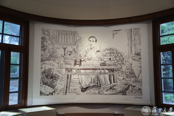 红印和蓝印马克思半身肖像的《共产党宣言》中文全译本早期版本书影,透射着这本“小册子”穿越百年的真理光芒;用铅笔绘制的陈望道还是未及“三十而已”的年轻模样,一手奋笔疾书,一手拿着沾了墨汁的粽子,“柴屋勤译”的场景被高度还原;右上角,位于上海市杨浦区国福路51号的《共产党宣言》展示馆(陈望道旧居)见证着他在复旦长期工作的岁月和复旦人对老校长故事的代代讲述、对“宣言精神”的忠实传承……