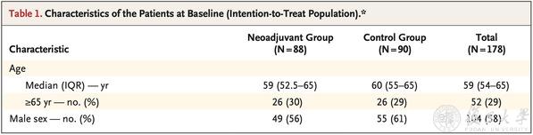 研究于2021年1月至2025年2月期间,共招募178例高危患者,按1:1比例随机分为新辅助组(88例)和对照组(90例)。其中,新辅助组患者术前接受3个周期的GEMOX化疗(吉西他滨1g/m2,D1,8+奥沙利铂 85mg/m2,D1;Q3W)+乐卫玛(8mg/天,PO,QD,90d)和特瑞普利单抗(240mg,IV,Q3W)新辅助治疗,治疗结束后2-4周内行手术切除。对照组患者术前不接受任何抗肿瘤治疗,直接行手术切除。两组患者术后均接受卡培他滨(2500mg/m2/d,分两次,PO,D1-14,Q3W)辅助治疗8周期。主要终点为无事件发生生存期(EFS),次要终点包括总体生存时间(OS)、客观反应率(ORR)、R0切除率、主要病理缓解率(MPR)、病理完全缓解(pCR)率、无复发生存期(RFS)、和安全性等,全程科学严谨,确保研究结果的可靠性。