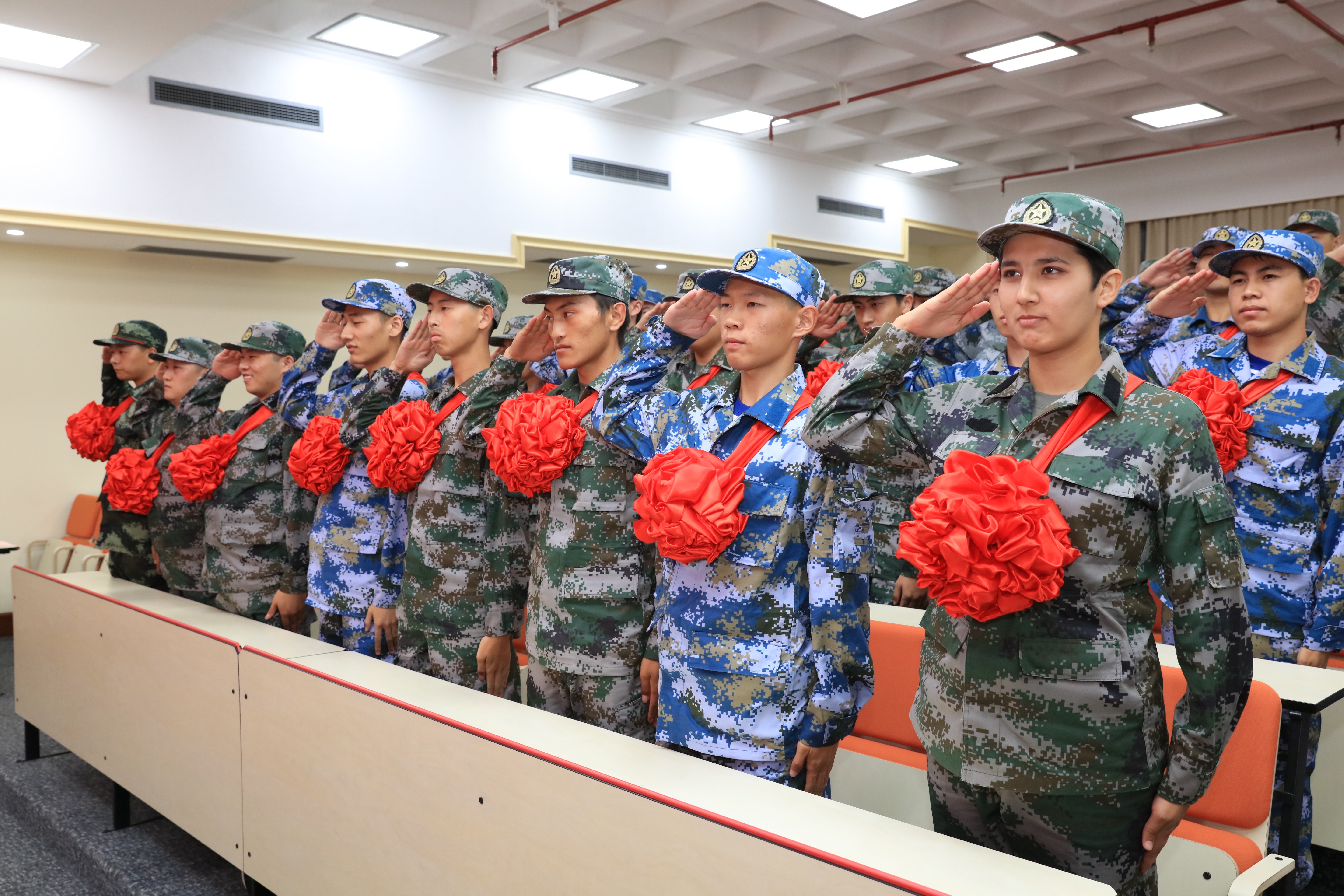 学工部负责人宣读2019年退伍学生名单,与会领导向退伍学生一一献花,武装部负责人宣读2019年入伍学生名单后,新兵依次上台领取入伍通知书和慰问金。
