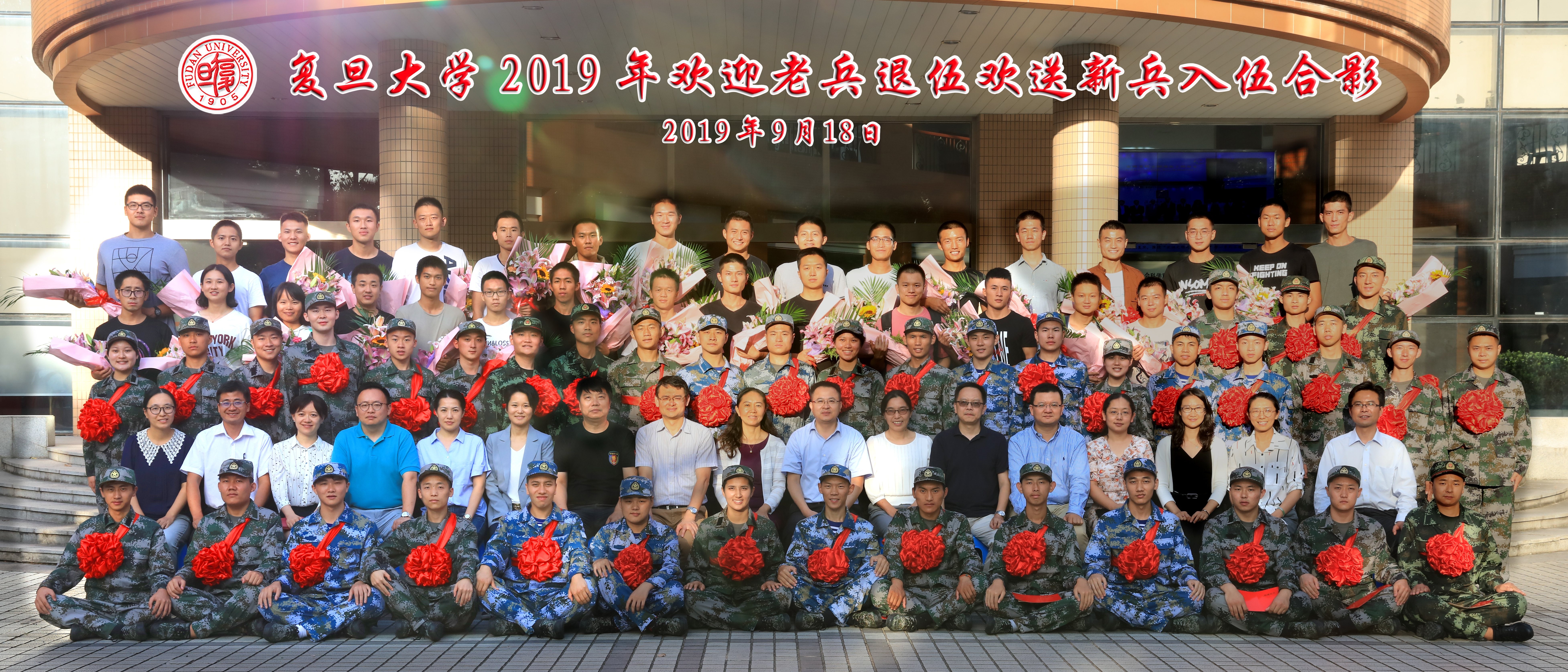 2019年9月18日下午,复旦大学2019年欢迎老兵退伍欢送新兵入伍大会在邯郸校区美研中心108室隆重举行。校党委副书记尹冬梅,武装部、学工部和研工部负责人出席大会,2019年退伍学生、入伍学生和部分院系学工负责人、辅导员等参加大会。