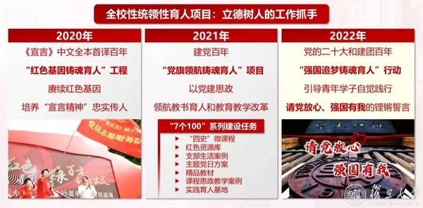 2020年宣言中译百年启动“红色基因铸魂育人”工程,2021年建党百年实施“党旗领航铸魂育人”项目,2022年抓住二十大召开和建团百年契机实施“强国追梦铸魂育人”行动……复旦大学铸魂育人“三部曲”奏响,回答着“培养什么人、怎样培养人、为谁培养人”这一根本问题,映照着“为党育人、为国育才”这颗不变的初心。