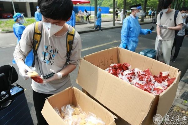 在物资安置点,机关职工志愿服务队成员正在将物资搬运至送货车,准备送往各个配送点。焦扬、金力一行对大家致以校庆日问候,表示在这次大战大考中,机关干部展现了不一样的风采,是学校的一支生力军。要发挥机关志愿者队伍的作用,释放学生志愿者压力,服务好学校立德树人的主业。大家冲锋在前,践行每个人的事业,学校为这支队伍感到骄傲光荣,相信在我们共同努力下,学校疫情防控一定可以取得胜利,“第一个复旦”的建设也一定可以大踏步地向前走。
