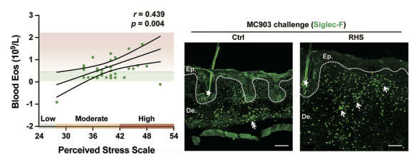 图1:AD患者的应激水平(PSS评分)与外周血嗜酸性粒细胞(Eos)的计数呈正相关(图左)。RHS应激范式处理后增加AD小鼠真皮中嗜酸性粒细胞(Siglec-F+,绿色)的浸润(图右)