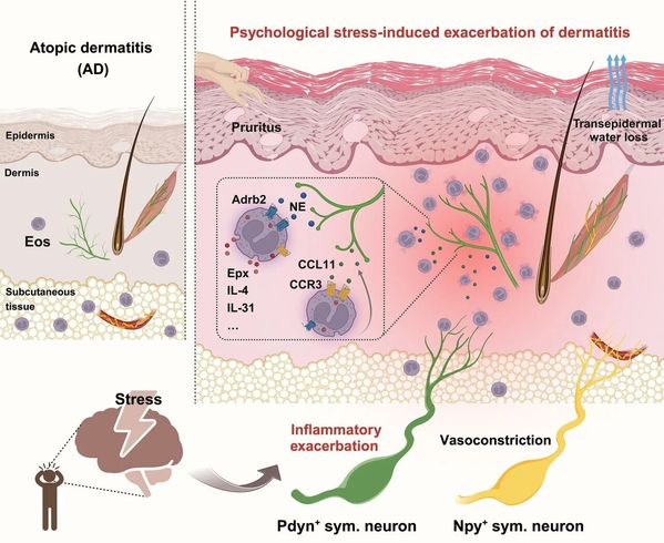 复旦大学上海医学院的研究团队发现,当大脑感知到心理应激时,会通过一条特定的交感神经通路,向皮肤发送“指令”,激活一种名为嗜酸性粒细胞的免疫细胞,从而加剧皮肤炎症。