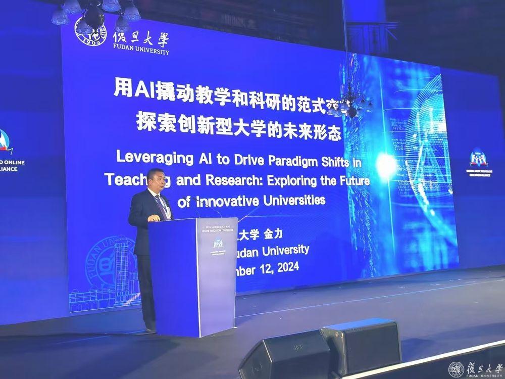 12月12日,金力一行出席2024世界慕课与在线教育大会,大会主题为“智能时代的未来高等教育重构”。中国教育部副部长吴岩和英国教育部国务大臣雅基·史密斯出席开幕式并致辞,联合国教科文组织教育助理总干事斯蒂芬妮亚·贾尼尼发表视频致辞。金力应邀作主旨报告,分享复旦大学建设AI大课的实践和经验。金力表示,智能化浪潮推动高等教育迎来深刻变革,复旦大学通过提升教师AI素养、创新“AI大课”课程体系建设、推进AI4S,探索未来创新型大学的形态。