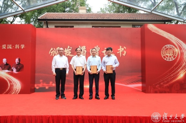 谈家桢先生长孙谈向东、陈建功先生之子陈翰晋颁发捐赠证书。