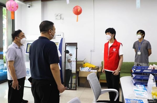 院领导一行来到东安路150号门和游泳馆临时观察用房,详细了解当前教职工入校流程以及入校后缓冲观察情况。在校园短驳车站点,院领导一行查看了东西院区之间短驳车运行情况,并慰问正在站点开展志愿服务的教师志愿者。在复旦大学图书馆医科馆和餐厅,院领导一行了解了在校学生的自习和用餐情况。进入公共区域,学生们均自觉佩戴N95口罩,并主动扫场所码,保持安全社交距离。在菜鸟驿站,院领导一行查看了快递消杀柜的使用情况,并详细了解快件的入校消杀流程,指出随着社会快递业务的逐步恢复,要严把物件的校园入口关。在学生公寓楼和学生事务一站式服务大厅,院领导一行慰问了值守的学生工作人员,感谢他们在疫情期间悉心保障学生的学习生活。不少即将毕业离校的学生前来服务大厅打印材料,院领导详细了解了学生们的毕业去向,并祝福毕业生们今后学习工作顺利,前程似锦。在游泳馆西侧核酸检测点,院领导一行了解了当前医学院核酸采样工作的情况,以及下一步常态化核酸采样工作的部署。