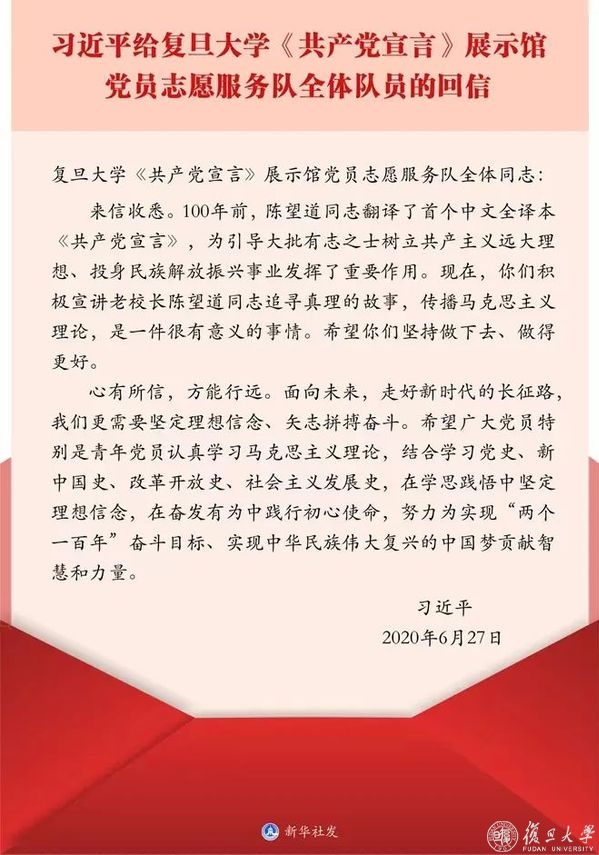 2020年“七一”前夕,习近平总书记给我校《共产党宣言》展示馆党员志愿服务队全体队员亲切回信,勉励师生“心有所信,方能行远”,号召党员特别是青年党员做《共产党宣言》精神的忠实传人。今年五月,总书记在庆祝中国共产主义青年团成立100周年大会上再次强调,实现中国梦是一场历史接力赛,当代青年要在实现民族复兴的赛道上奋勇争先。