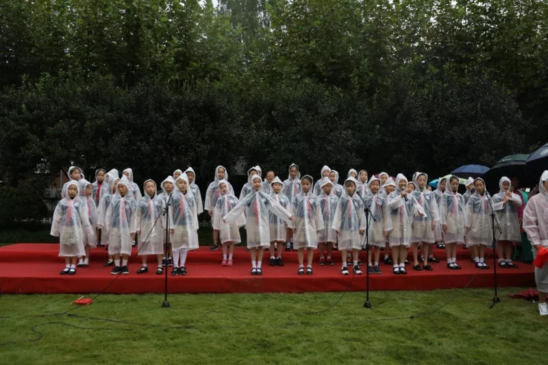 昂扬的小号吹响,国旗护卫队步履铿锵地护送五星红旗进场,升旗仪式正式开始,悠扬的国歌声中,五星红旗冉冉升起,在场全体师生员工在风雨中肃穆而立,致以注目礼。