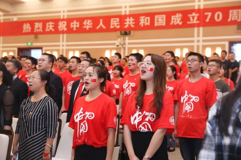 在邯郸校区,光华楼东辅楼202报告厅汇成一片红色的海洋。“热烈庆祝中华人民共和国成立70周年”横幅高挂,鲜艳的五星红旗在手中挥舞、在胸前闪亮,“我和我的祖国”定制校名T恤衫映衬着青春朝气,“不忘初心 砥砺前行”“奋斗七十载 共结中国心”“日月光耀七十载 华夏儿女共此时”“中华民族心连心 协力共圆中国梦”等数十块多彩的KT板标语道出师生们心间的喜悦与昂扬。