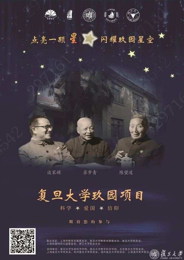 “点亮一颗星,闪耀玖园星空”众筹计划,以上海市教育发展基金会作为公募平台,携手复旦大学教育发展基金会、复旦大学校友会、上海民盟同舟公益基金会、浙江大学校友总会联合发起,这也是上海市教育发展基金会发挥社会组织枢纽作用,赋能大学基金会,助力教育事业发展的创新之举。